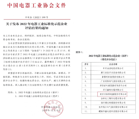 智慧INT | 南京因泰萊獲得中國電器工業(yè)標(biāo)準(zhǔn)化示范企業(yè)稱號